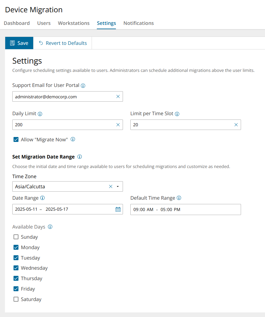 The Settings tab helps you set company-wide time slots when workstation or device migration can occur.