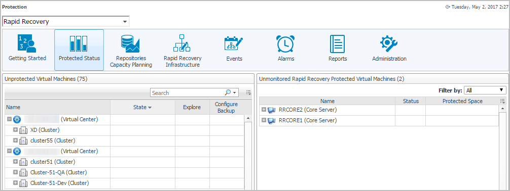 The Protected Status view of the Protection dashboard shows the unprotected virtual machines and unmonitored Rapid Recovery Protected virtual machines on the monitored Rapid Recovery Core. The Protected Status view includes the following two tables: