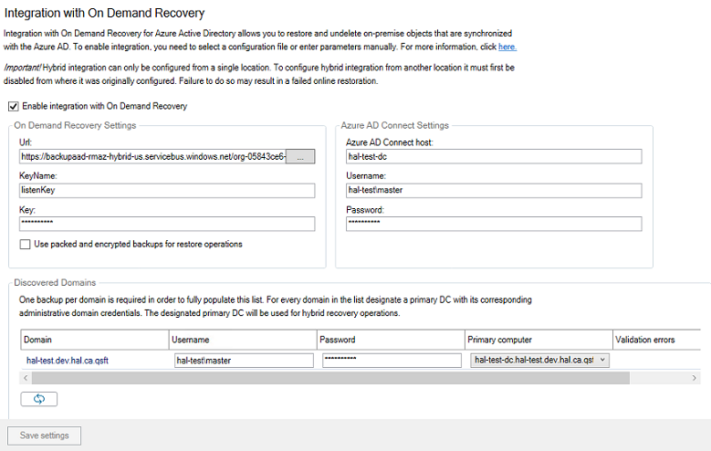 • Click the Download hybrid credentials button on the dialog to download the required connection credentials. This file will be used to configure the On Demand Recovery Settings in the Recovery Manager for Active Directory console.