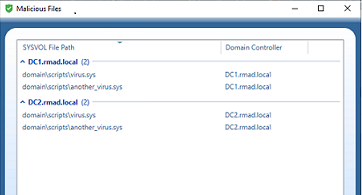 Malicious files are shown for each backup selected for a domain controller, and the list can be grouped and/or sorted by SYSVOL File Path and Domain Controller. A list of the files is also included in the Forest Recovery Report, click View | Report….