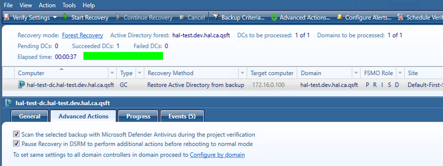 Domain controller recovery settings and progress