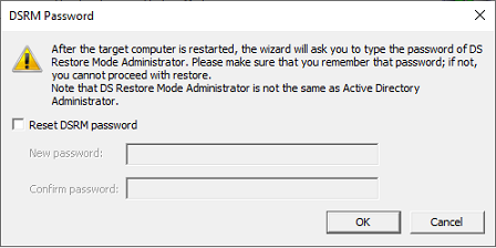 When you click Next a pop-up dialog will appear to allow you to reset the Directory Services Restore Mode (DSRM) password.