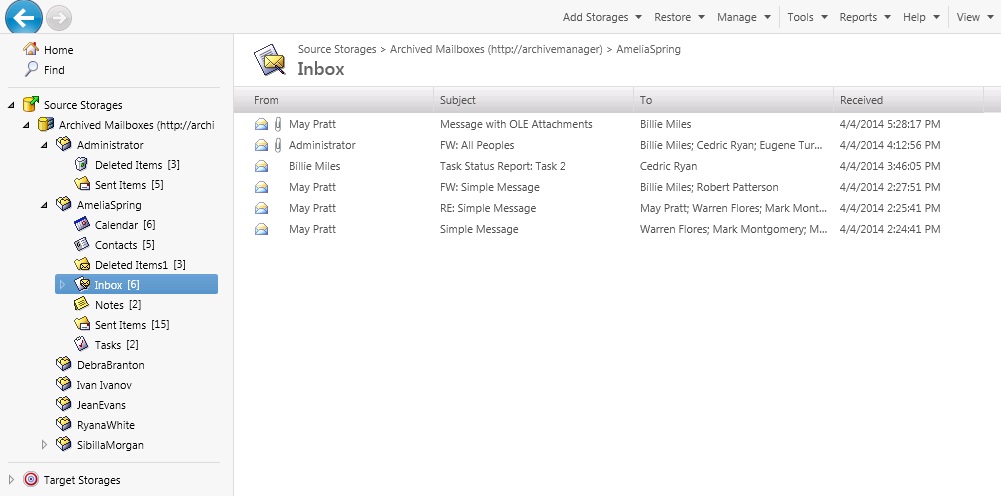 When browsing source storages, you can use commands on the Action menu or on the shortcut menu to manage the item you selected. Both the Action menu and the shortcut menu include commands to preview and restore the selected message or its attachments.
