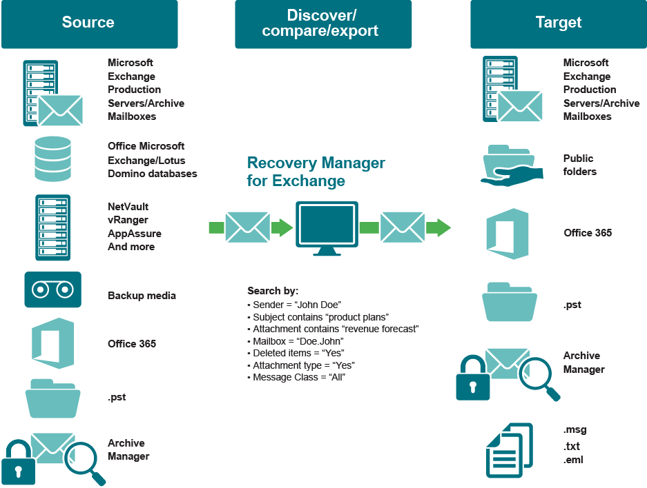 • Search and recovery for all Exchange content types. With its ability to search backed-up message and attachment content and recover selected public folders and public folder hierarchies, Recovery Manager for Exchange allows you to search and recover all Exchange backup data. Since a significant amount of corporate email data is found within attachments, being able to discover this data is crucial to any operational or compliance-driven recovery effort.