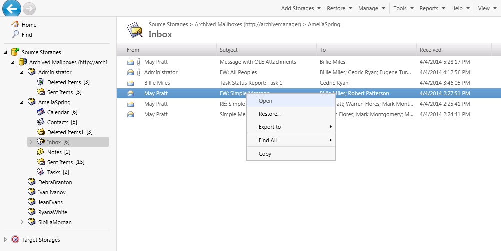 When browsing source storages, you can use commands on the Action menu or on the shortcut menu to manage the item you selected. Both the Action menu and the shortcut menu include commands to preview and restore the selected message or its attachments.