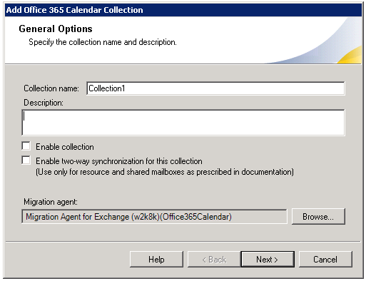 Caution: For regular calendar synchronization, the Enable two-way synchronization for this collection option should stay cleared. Select it only if your calendar collection contains shared and/or resource mailboxes which will be used by source and target users at the same time during co-existence period.