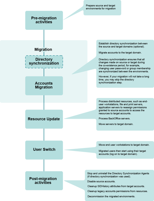 1. Establish directory synchronization between the source and target domains (optional). Configure the Directory Synchronization Agent to synchronize only object properties (including passwords and group membership) for all accounts within the specified synchronization scope. This ensures that all properties of source and target users are kept in sync during the co-existence period. If the coexistence period is short, you can skip this step.