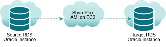 In this scenario, SharePlex runs as an EC2 Amazon Machine Image instance in two different AWS regions: one for the source database in region 1 and the other for the target database in region 2.