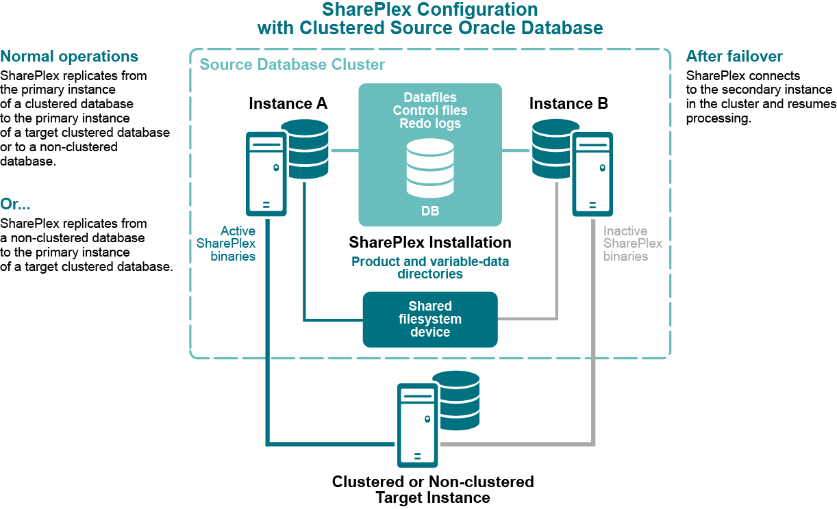 SharePlex integrates with Oracle Clusterware cluster hardware and software to maintain the high availability of data capture and uninterrupted replication to your targets. If the node where SharePlex is running fails or must be taken out of the cluster for maintenance, SharePlex can be started on another server by the cluster software. SharePlex start and stop is controlled through the cluster.