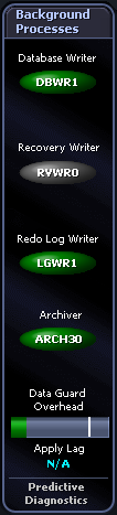 An alarm raised on this control indicates an alarm on Spotlight on Oracle Data Guard - NOT necessarily an alarm on the apply lag. For more information on the alarm raised, open the Spotlight on Oracle Data Guard home page(s) for this Primary database. The severity of the alarm on this control matches the highest severity alarm raised on Spotlight on Oracle Data Guard.