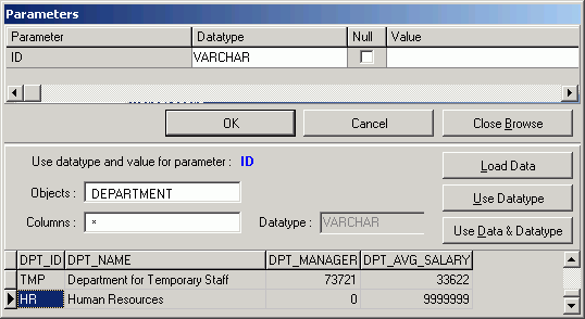 Click Browse to expand the Parameters window. The bottom pane appears displaying object and data information corresponding to the selected objects from the SQL statement. Select the object to browsed using the Objects and Columns lists. If a column is selected (asterisk * selects all columns from the selected object), the corresponding data type is shown.