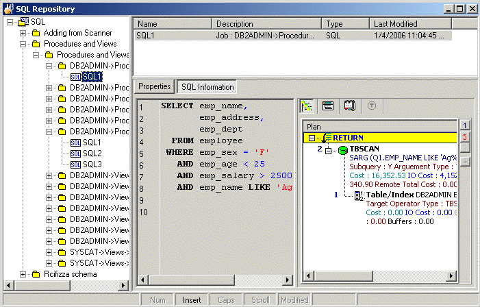 The SQL Repository window displays the information about the SQL statements that are saved in the SQL Repository. It is divided into three panes.