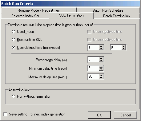 The SQL Termination page of the Batch Run Criteria window is used to set the termination criteria for the SQL statement while retrieving the run time. If the current run time for a particular Index Set exceeds the termination time, then it will be terminated automatically which will save time during testing.