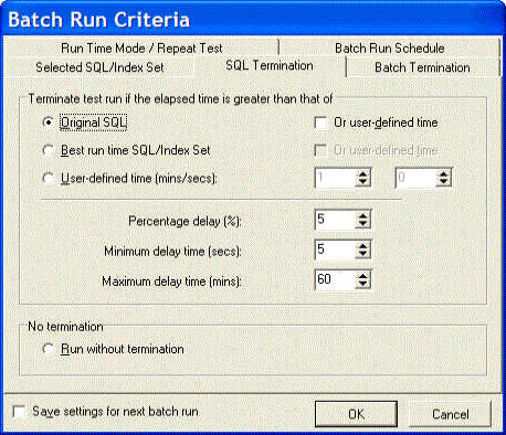 This checkbox is disabled if Original SQL is selected as a termination criterion on the SQL Termination tab or the Batch Termination tab since the run time from the original SQL is going to be used to terminate the alternatives or to terminate the Batch Run itself. In this case, you must run the original SQL statement first to obtain the termination time.