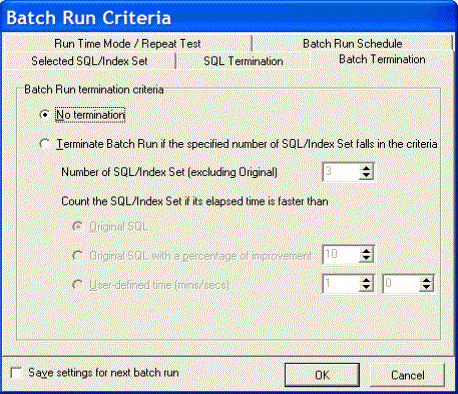 The Batch Termination page of the Batch Run Criteria window is used to determine if and when to terminate the Batch Run. It enables you to find SQL and index-set alternatives that give you performance improvement without having to execute every alternative.
