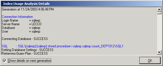 The Index Usage Analysis Details window displays after the batch run process is completed unless the Show details on next batch run checkbox in the Index Usage Analysis Details window is unchecked.