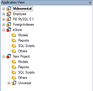 All currently opened projects, models and their workspaces are listed in the Application View (AV). There, you can: