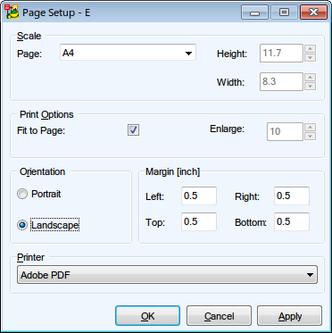 • To set size of the pages, select File | Page Setup. To customize the page size, see the Page Setup dialog | Scale area | and from the Page box, select Custom. Define Height and Width on the right.