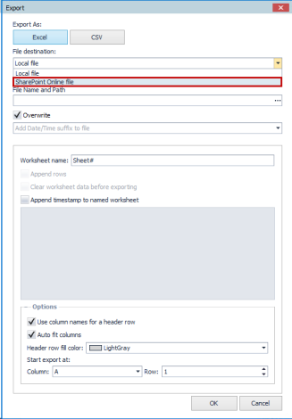 Note: When exporting data to an Excel or CSV file stored on SharePoint Online Server, the file path will be greyed out as a distinct difference between locally stored files.