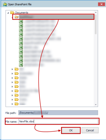 • Select folder where you want to save an Excel or CSV file on SharePoint Online Server and in the File name field, type the desired name for your new file