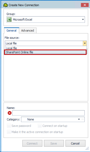 o Choose an existing file on the SharePoint Online Server (already specified through connection, or you can choose a different one), or
