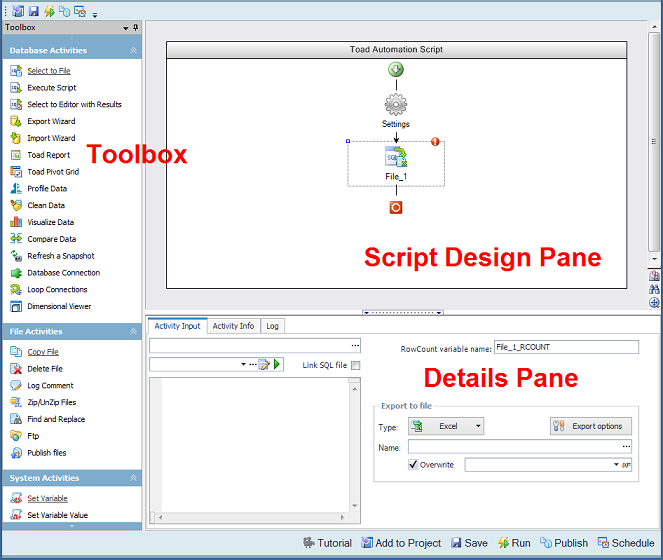 Toolbox—Stores the Automation activities. Click an activity in the Toolbox to add it to the script design pane. Activities are listed by category: Database, File, or System.
