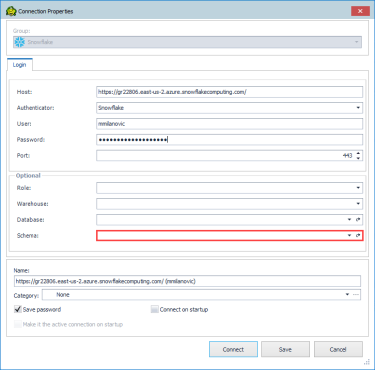 For Snowflake users who work with large databases, we have implemented a mechanism that allows users to specify a schema that is present in the connection window, and only objects from that specific schema will be loaded and displayed in the Object Explorer panel. Adding this solution reduces connection/load times.
