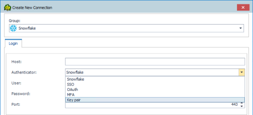 The Key pair option has been added to the Authenticator drop-down list in the Connection window.