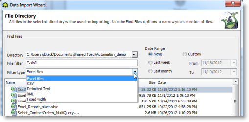 Note: The filters you select are applied at execution time, so Toad uses the most-current files in the directory, including new files that match the filter criteria.