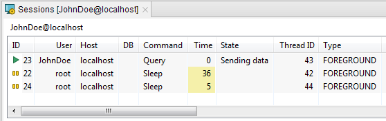 • This view displays all current database sessions and is updated continuously. Observe all connected users and the states of their sessions while also being able to stop any of them, assuming you possess the appropriate privileges