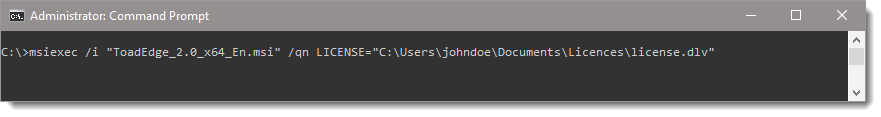 msiexec /i "ToadEdge_2.12.0_x64_En.msi" /qn LICENSE="C:\Users\johndoe\Documents\Licences\license.dlv"