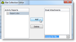 Click Add Attachments to attach one or more files to the email. The File Collection Editor opens and displays the list of files that your script creates in the activities that precede this one. In this case, the output file you specified in the Select to File activity is listed.
