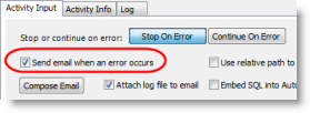 In the Activity Input tab, select the Send email when an error occurs option.