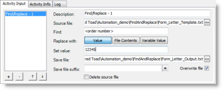 The Find and Replace activity in Automation allows you to customize form reports and emails. You can use the Find and Replace activity in a script to customize a single output or to generate a series of unique reports or emails using your template and inserting information retrieved by a query.
