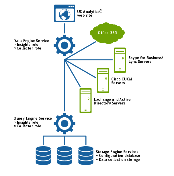 The Data Engine contains all the business logic for the product. It determines how UC Analytics stores data and performs the data collections. The Data Engine includes the custom logic used for insights, licensing, tiles; in short, all the logic that defines UC Analytics as a product. You can install multiple data collectors.