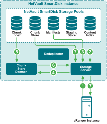 • Chunk Store Daemon: The NetVault SmartDisk Chunk Store Daemon is the only process that writes to the Chunk Index and Chunk Store. There is only one CSD per NetVault SmartDisk Instance. The CSD also manages the Garbage Collection process.