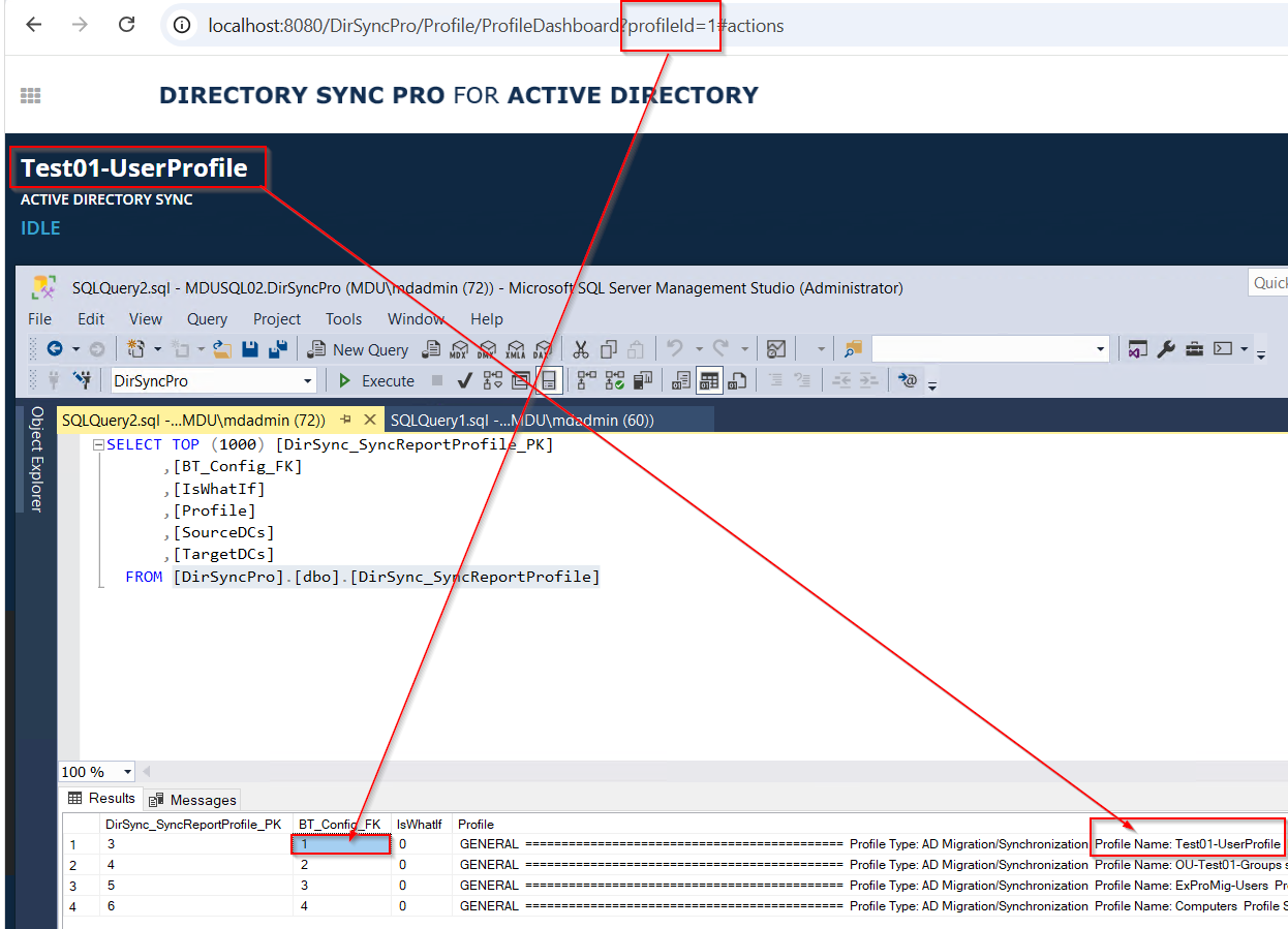 When you navigate to the appropriate DirSync profile, you can also see your profile ID in the URL in your browser. That ID is also stored in the [DirSyncPro] database in the table [dbo].[DirSync_SyncReportProfile], under the column BT_Config_FK.