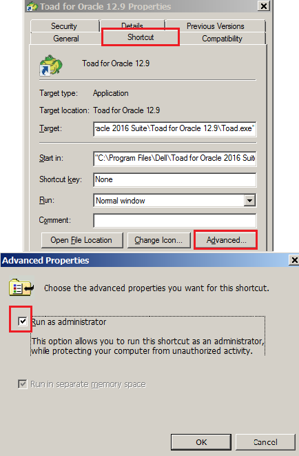 Uncheck the 'Run as Administrator' box in the Toad shortcut. By default, Toad does not need to be run at an elevated level.