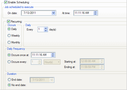 - To run the job on a recurring basis, select a start date and time, and select the Recurring check box.