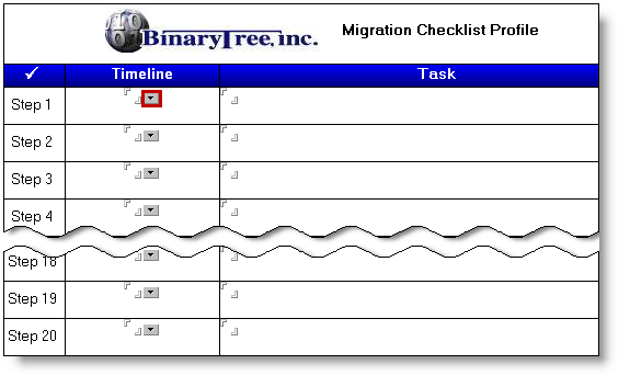 The Migration Checklist is a personalized list of tasks which can be used to help manage the migration project. Determine, then classify or group the major steps you consider necessary to manage your migration project. Determine the sequence, timeline, and description for each migration task and enter them into the Migration Checklist.