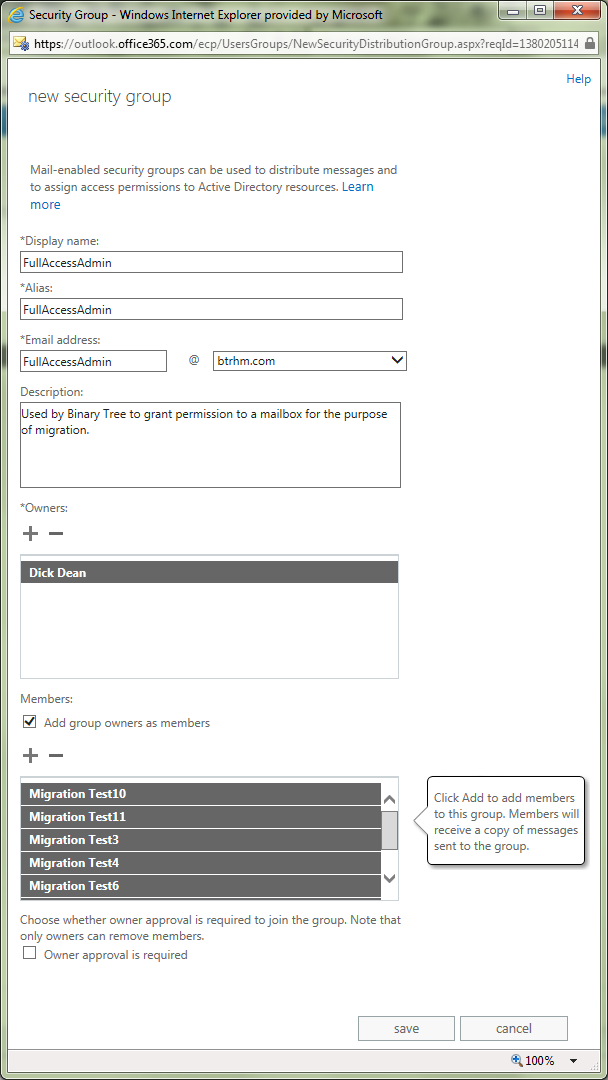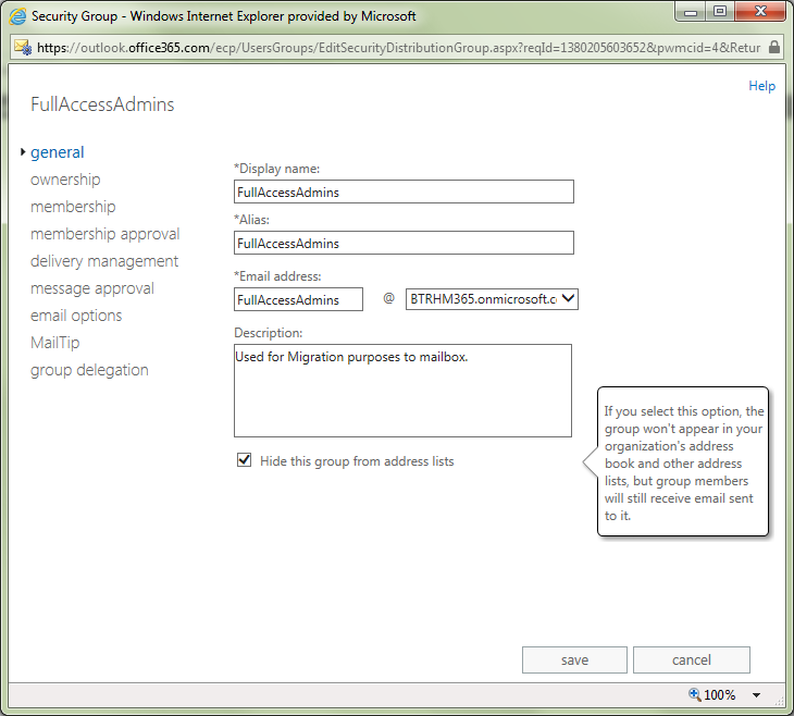 1. Create Full Access Security Groups in Office 365 - this is used for the Set Full Access process which should be run just after an account is activated and enables permission access for the migration worker Outlook account to the user’s Exchange online mailbox. The system default name for this group is FullAcessAdmin but can be changed on the Settings | Office 365 tab.