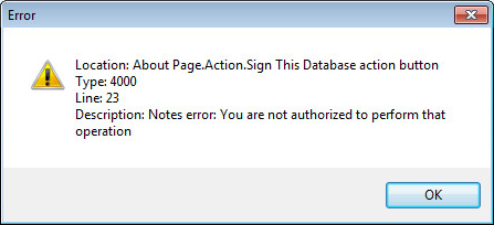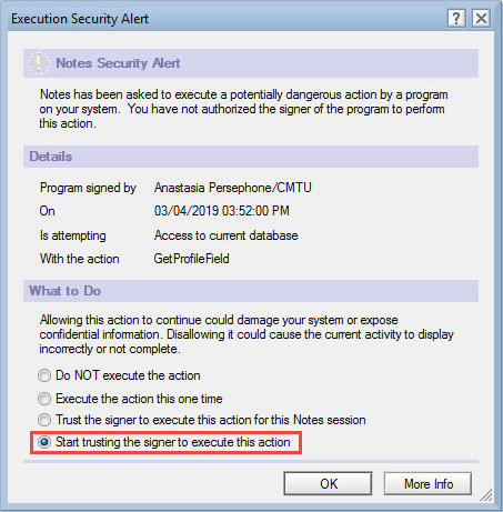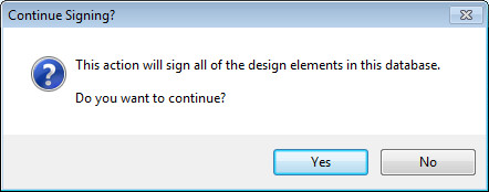 Alternately, all Execution Security Alerts can be prevented from reappearing by signing the database. Prior to opening the database, ensure that the Notes ID used to sign the database is trusted by every Notes client and Notes server throughout the organization.