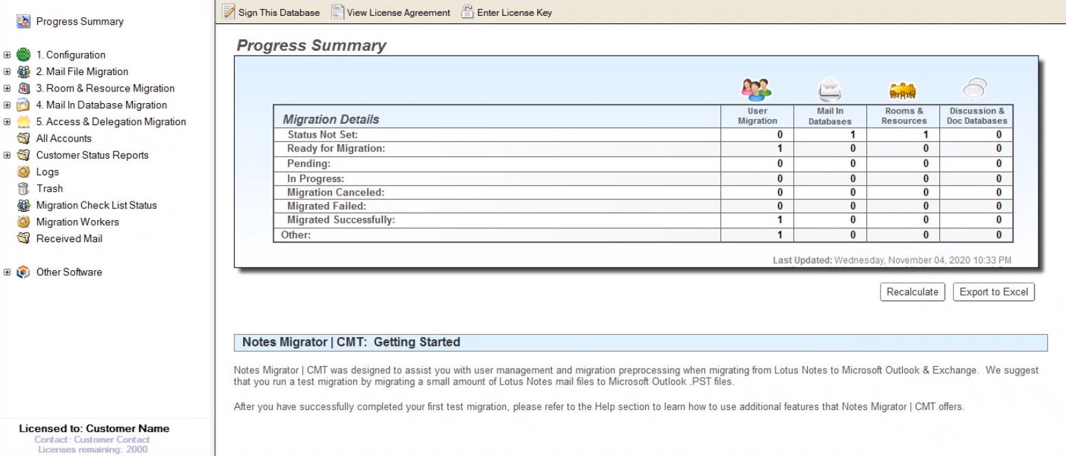 The Progress Summary is an overview of accounts in the Migrator for Notes nsf application, this is not used for migration license tracking.