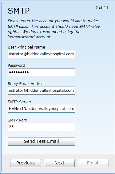 In this SMTP screen: Enter the User Principal Name, Password, Reply Email Address (e.g., user@domain.com), SMTP Server, and SMTP Port of the account to use for SMTP calls.