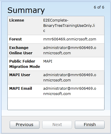 The Summary screen shows the settings and choices you have entered to configure your tenant target forest.  Review the settings to make sure they are correct for the designated tenant forest.  (If you want to change anything you can click Previous to return to an earlier screen.)