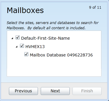 On this Mailboxes screen: Select the sites, servers, and databases to search for mailboxes. All content is selected by default. Right-click in the list area to select options to expand/collapse the list or select/deselect all items.