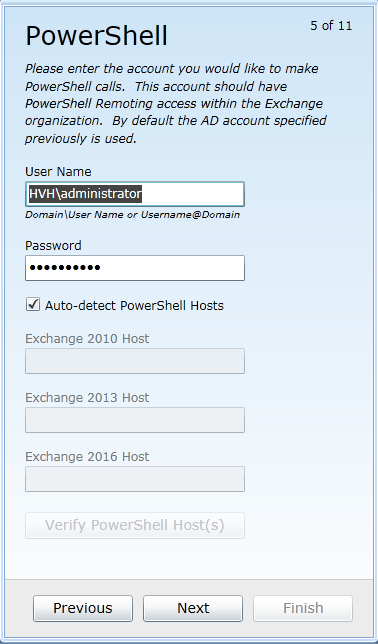 You can either automatically select the PowerShell hosts by keeping the Auto-detect the PowerShell Hosts checkbox selected, or deselect it to manually specify the Exchange 2010 Host, Exchange 2013 Host, and Exchange 2016 Host. If specifying the hosts manually, click the Verify PowerShell Host(s) button to validate connectivity to the PowerShell host servers.