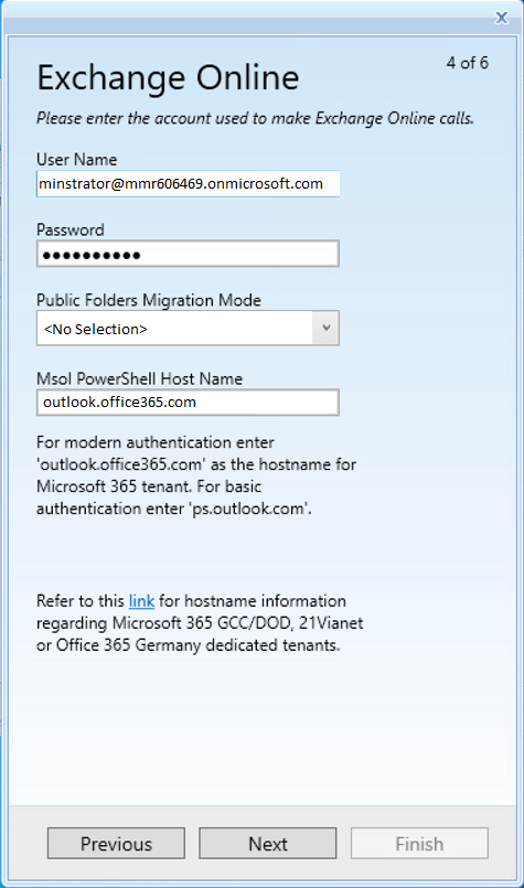 Enter the User Name and Password for the account Migrator Pro for Exchange should use to access Office 365.
