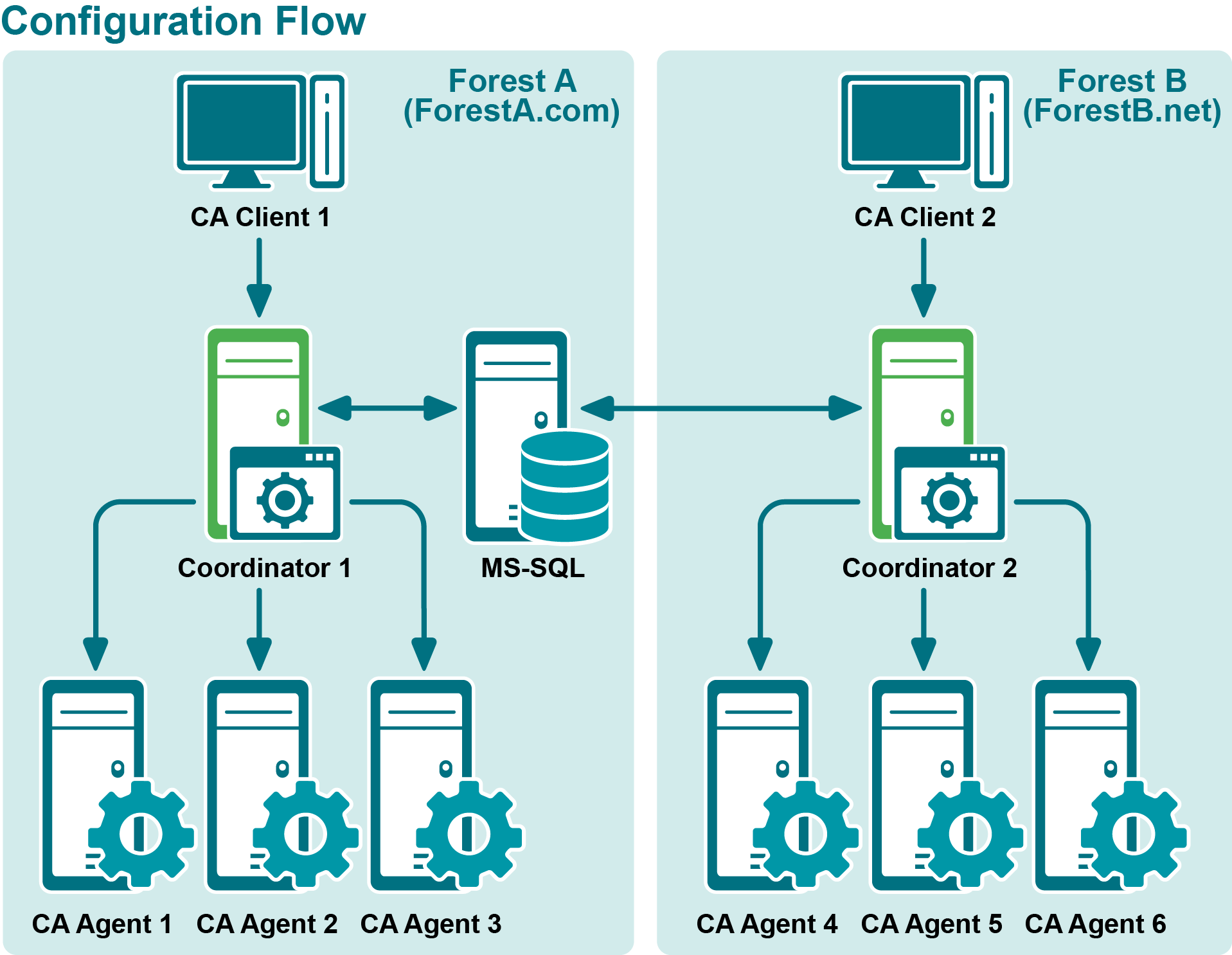 Audit and protection configurations are maintained using the client that is installed on either workstations or member servers. Configuration changes are stored in the SQL database by the coordinator service.