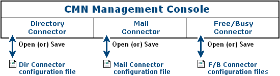 CMN's Directory Connector, Mail Connector and Free/Busy Connector are configurable, and most of their feature options are set in CMN's Management Console. The Management Console is a friendly interface between you and a set of configuration files that CMN components read every time they are started.